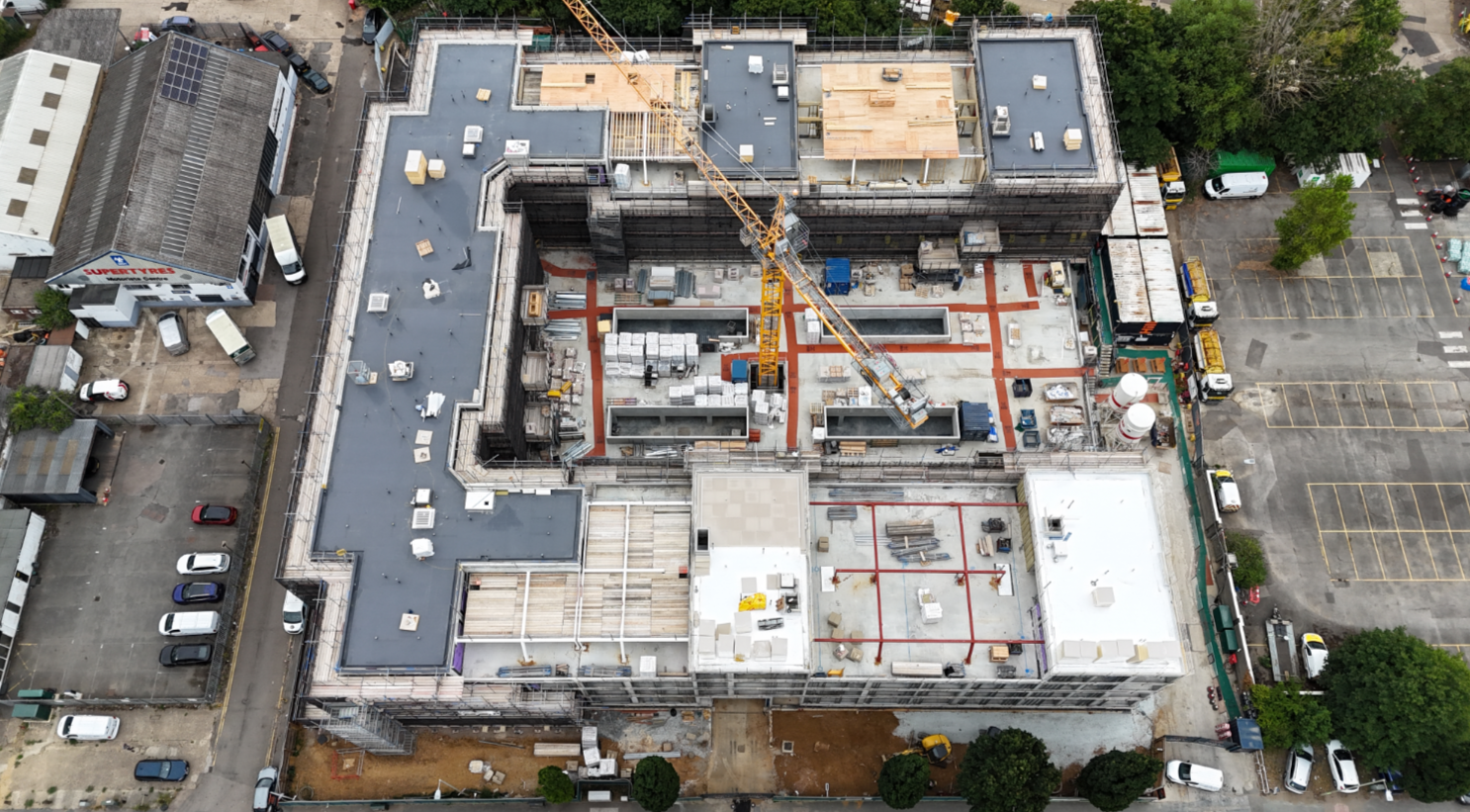 Broadwater Road is a four-storey residential development and landscaped podium to the centre for Hill Group UK, and it topped out recently. Apart from a few tiny bits, the structure is complete and the architectural finishes will soon be added.